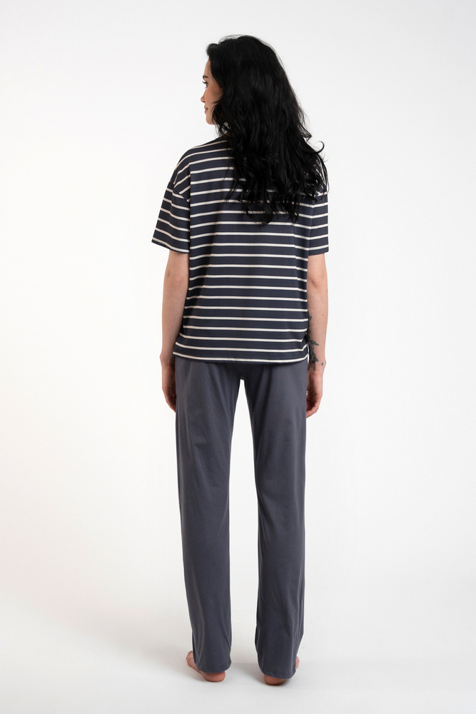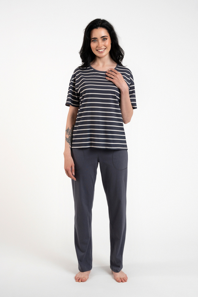 I pigiami da donna con pantaloni lunghi e maniche corte sono un'ottima opzione per le notti autunnali, sia a casa che in vacanza o in viaggio d'affari. Il taglio leggero del pigiama da donna - top largo e pantaloni a zampa dritta - assicura un sonno confortevole, mentre il cotone 100% si prenderà cura del piacere della pelle, permettendole di respirare. Il set da notte da donna è disponibile in due colori, grafite e cappuccino, e nelle taglie dalla S alla XXL.