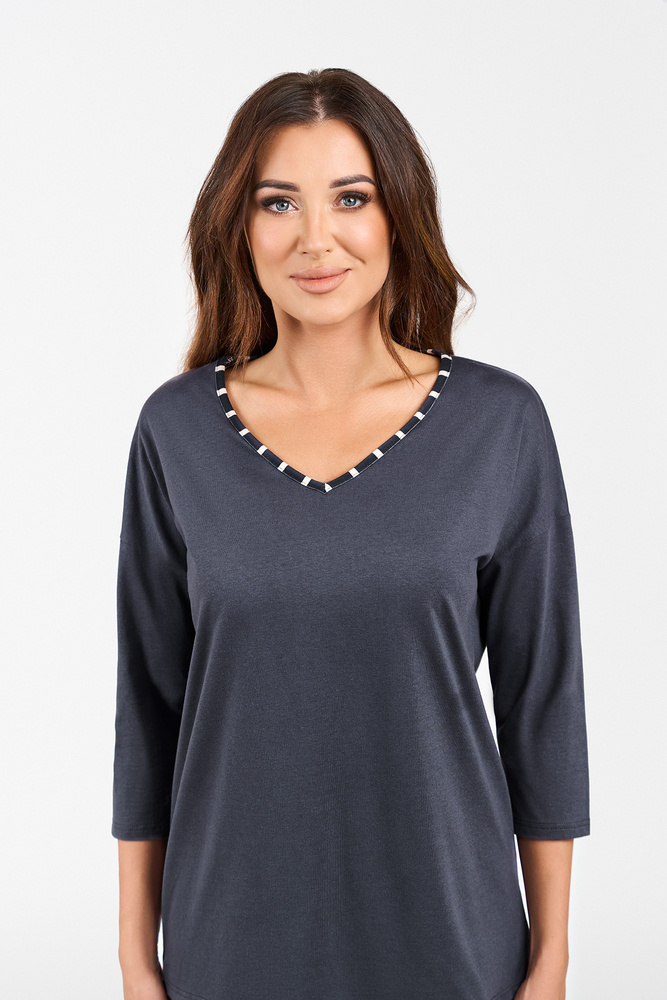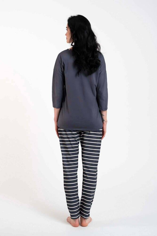 Il pigiama da donna in cotone con pantaloni lunghi e maniche a ¾ è un classico set da notte, ideale per le notti più fresche. Il materiale leggero permette alla pelle di respirare e la vestibilità ampia garantisce comfort e libertà di movimento. Questo pigiama da donna ultra-confortevole ha i pantaloni ornati da un motivo a righe, mentre il top è rifinito con uno scollo a V con un delicato motivo di. La leggerezza e l'eleganza di questi pigiami da donna piaceranno a tutte le donne. I pigiami in 100% cotone sono disponibili in due colori, grafite e cappuccino, e nelle taglie dalla S alla XXL.