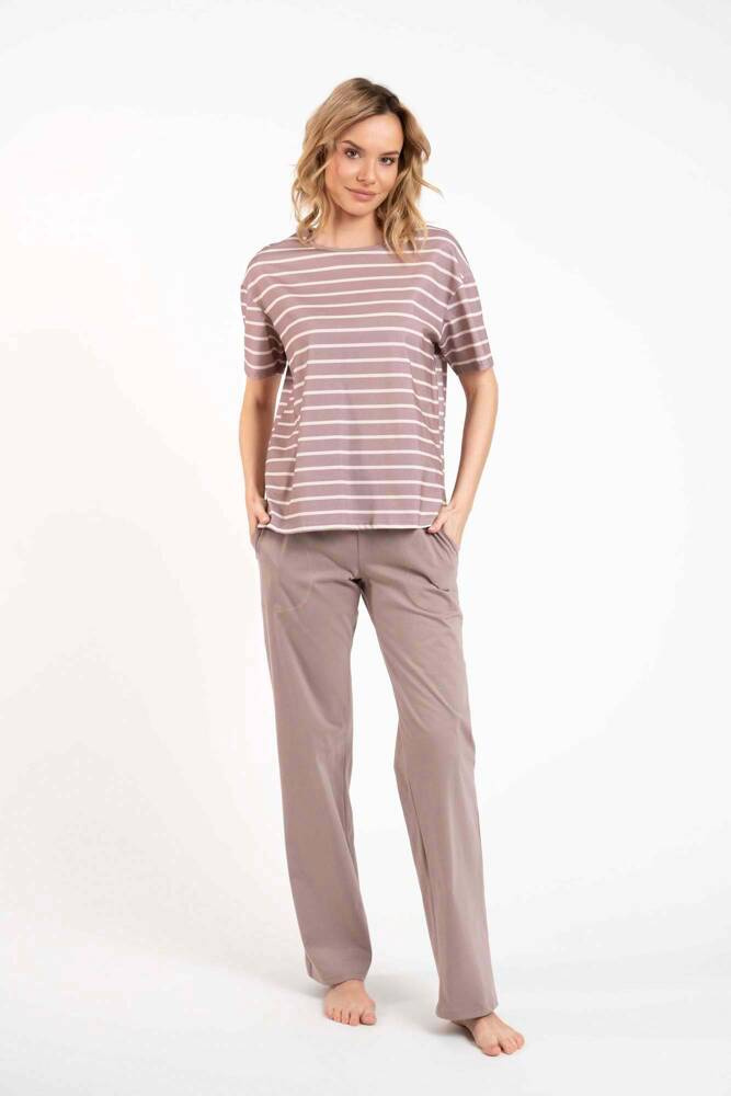 I pigiami da donna con pantaloni lunghi e maniche corte sono un'ottima opzione per le notti autunnali, sia a casa che in vacanza o in viaggio d'affari. Il taglio leggero del pigiama da donna - top largo e pantaloni a zampa dritta - assicura un sonno confortevole, mentre il cotone 100% si prenderà cura del piacere della pelle, permettendole di respirare. Il set da notte da donna è disponibile in due colori, grafite e cappuccino, e nelle taglie dalla S alla XXL.