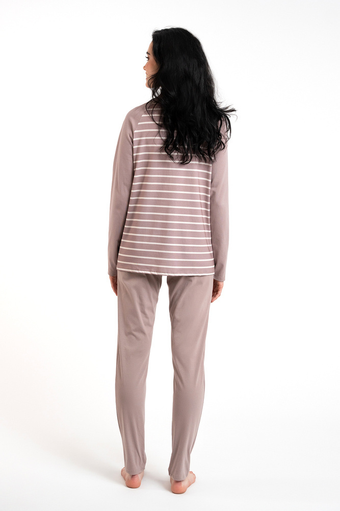 I pigiami da donna con pantaloni lunghi e maniche lunghe sono un classico che va bene sia per le notti più fresche a casa che per le gite fuori porta. Un pigiama elegante e femminile, dalla vestibilità rilassata, vi garantirà un sonno confortevole, mentre il tessuto sicuro e traspirante - 100% cotone - si prenderà cura del piacere della vostra pelle. L'intramontabile motivo a righe si adatta alle donne di tutte le età. Pigiama da donna leggero con elastico non rimovibile, dallo stile semplice, che non può mancare nel guardaroba di ogni donna. I pigiami da donna in cotone sono disponibili in due colori, grafite e beige, e nelle taglie dalla S alla XXL.
