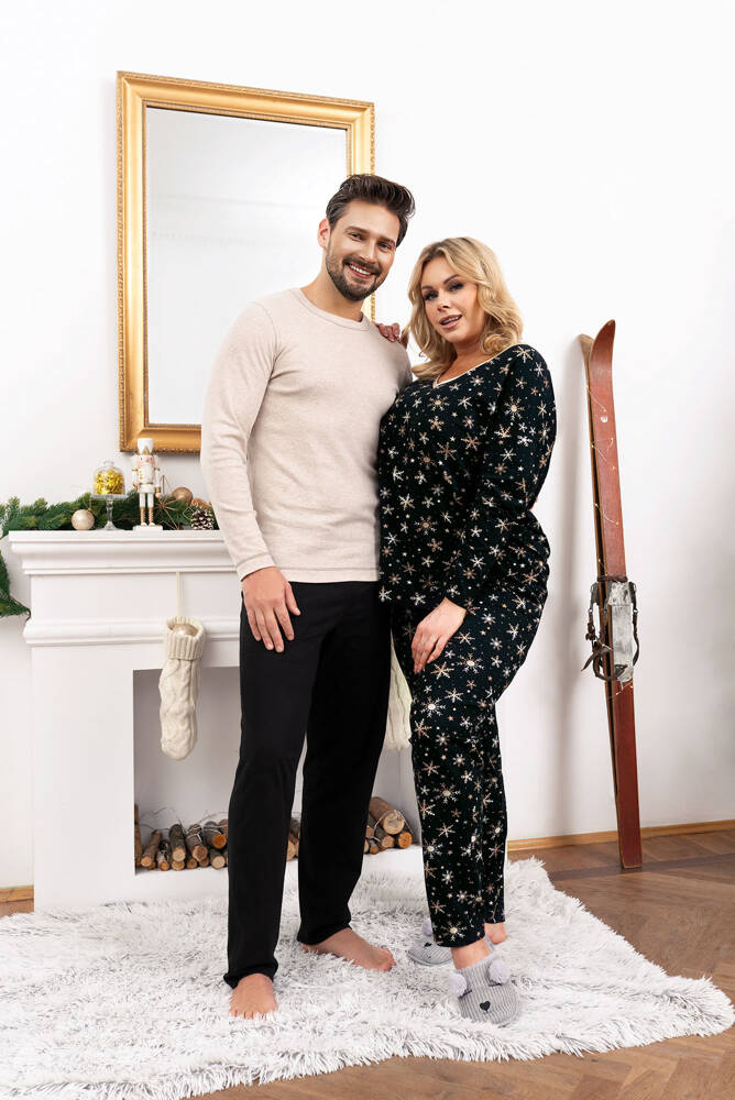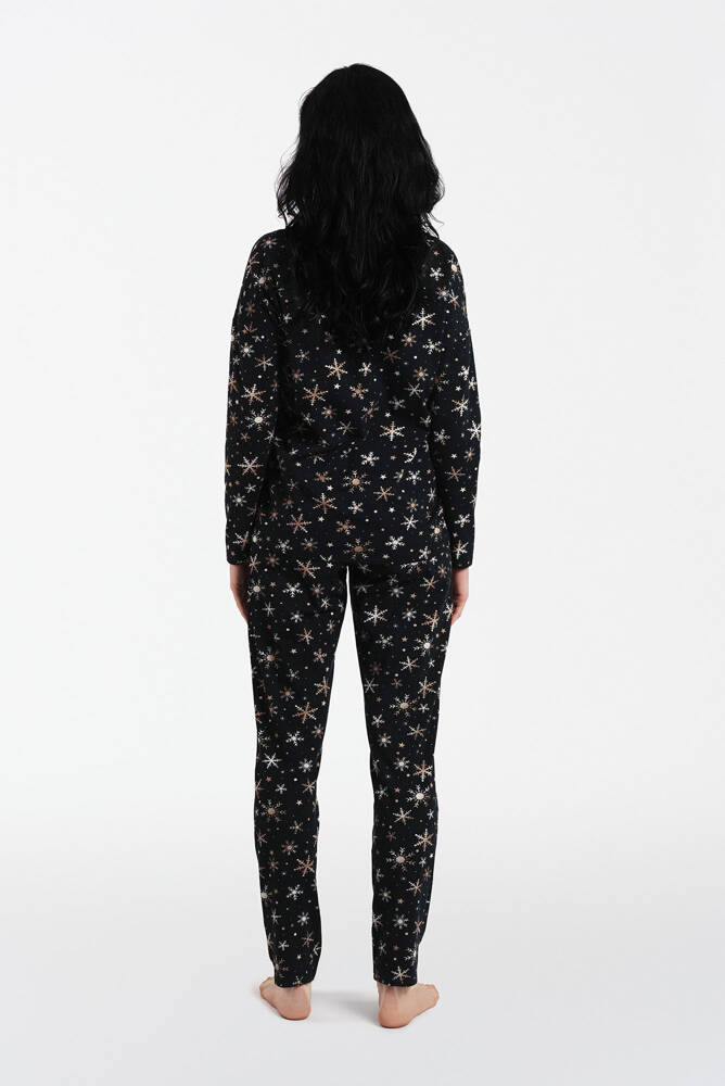 Il pigiama perfetto per le notti fredde? Non solo caldo, ma anche... in fiocchi di neve! Questo grazioso pigiama da donna, decorato con un bellissimo motivo a fiocchi di neve, farà la gioia di tutte le donne. Il pigiama in cotone ha un taglio dritto che non limita i movimenti e garantisce il comfort. Il top pigiama da donna a maniche lunghe con pantaloni lunghi è caratterizzato da una scollatura a girocollo rifinita in raso decorativo. I pigiami sono ricoperti da simpatici fiocchi di neve. Questo pigiama da donna alla moda è disponibile nelle taglie dalla S alla XXL, in nero con sfumature beige.