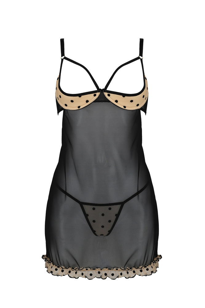 La sensuale chemise Martina è una proposta del marchio Passion. Il morbido tulle avvolge il corpo e le coppe aperte sollevano il seno e lo espongono con frivolezza. Il set è disponibile in due versioni di colore: nero e beige.
