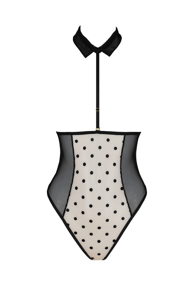 Questo body Trisha, molto sexy, è una proposta del marchio Passion, che si rivolge a donne consapevoli del proprio corpo e della propria femminilità. Ideale per ogni momento e ogni occasione in cui si vuole dare spettacolo. Modello presentato scoprendo completamente il seno. Legatura a corsetto nella parte posteriore per una vestibilità confortevole. Un sexy girocollo staccabile a forma di colletto aggiunge carattere all'intero outfit. Modello disponibile in due versioni di colore: nero e beige.