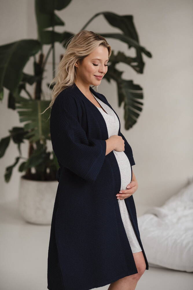 Szlafrok został zaprojektowany z myślą o mamach, dlatego jest nieco dłuższy, abyś spokojnie okryła nim ciążowy brzuszek. Po porodzie bez skrępowania b będziesz mogła spacerować po szpitalnym korytarzu lub na leżąco nakarmiła maluszka w połogu. Posiada kieszenie na niezbędne drobiazgi i pasek do regulowania szerokości.