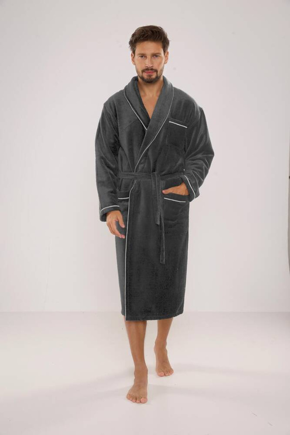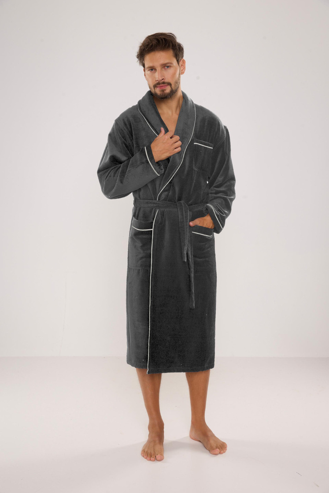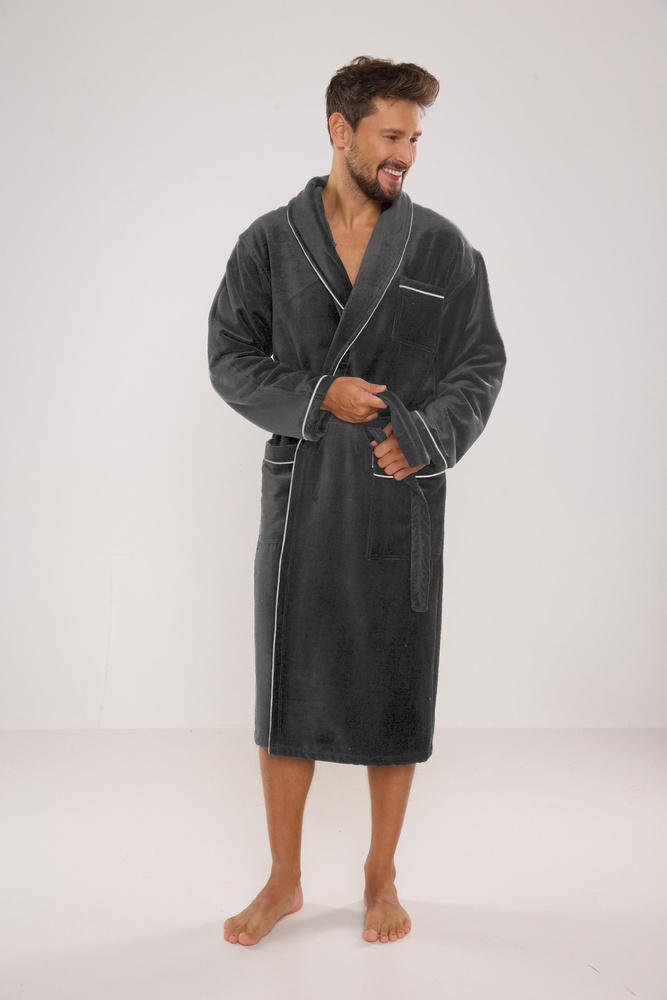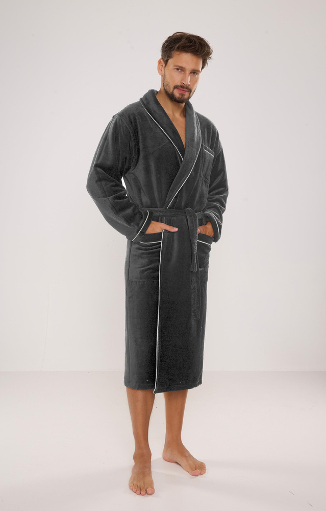 Accappatoio lungo da uomo in velluto. Modello con collo a scialle, legato in vita, con due tasche applicate sui lati e una al petto. Wrealizzato al 50% in morbida spugna di cotone. Material piacevole con una sensazione di morbidezza e un eccellente assorbimento dell'acqua.
