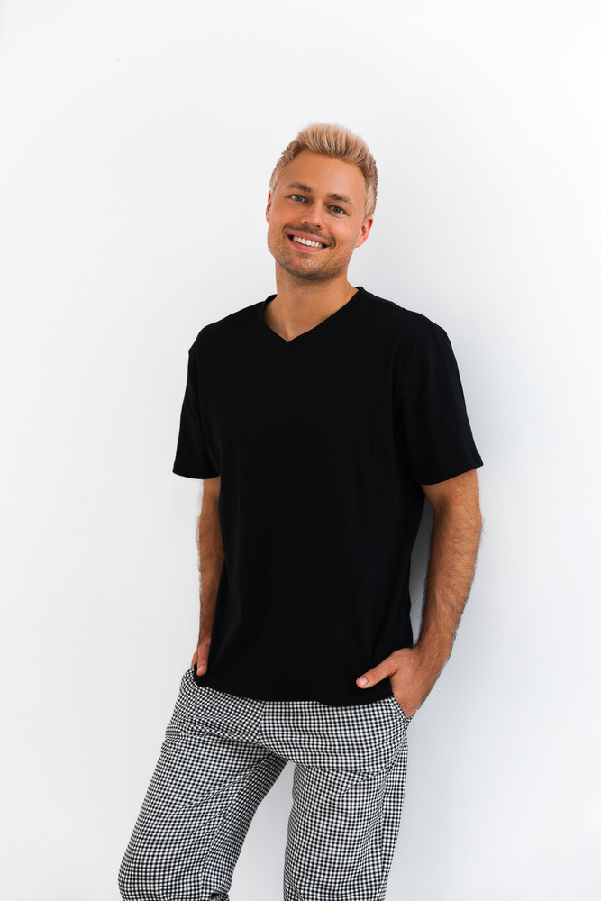 Comodo e conveniente pigiama da uomo in cotone di alta qualità. Maglietta a maniche corte. Completo di pantaloni lunghi a fantasia. Confortevole fascia elastica in vita. Modello con tasche.