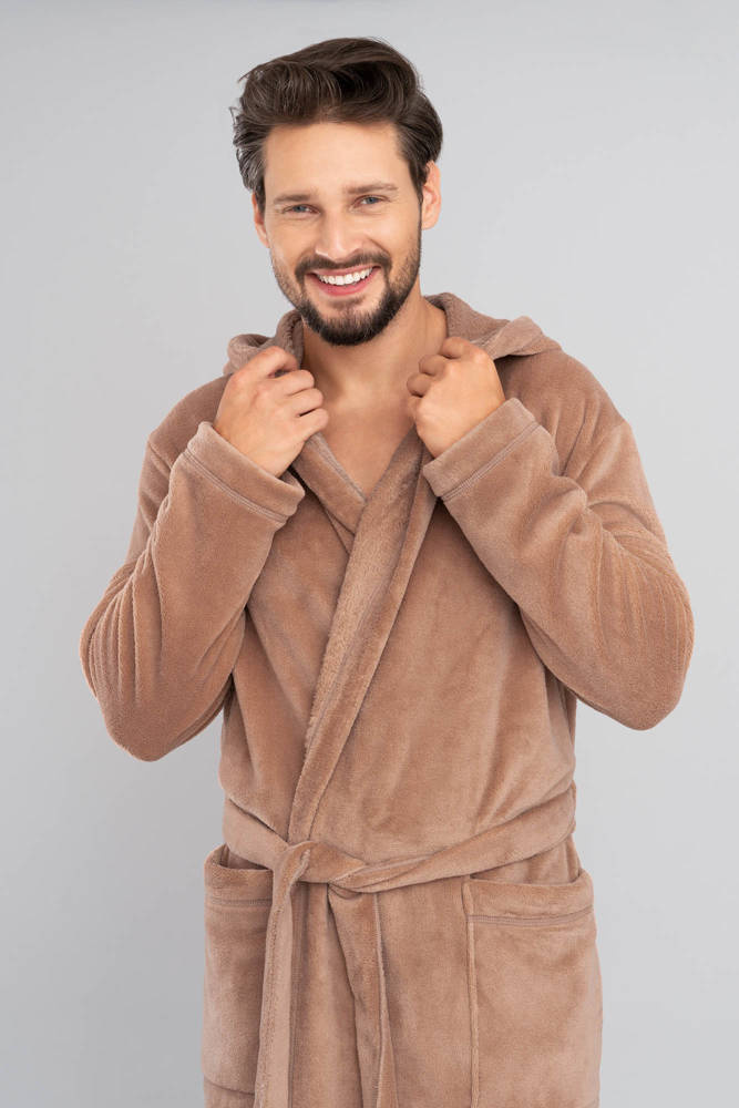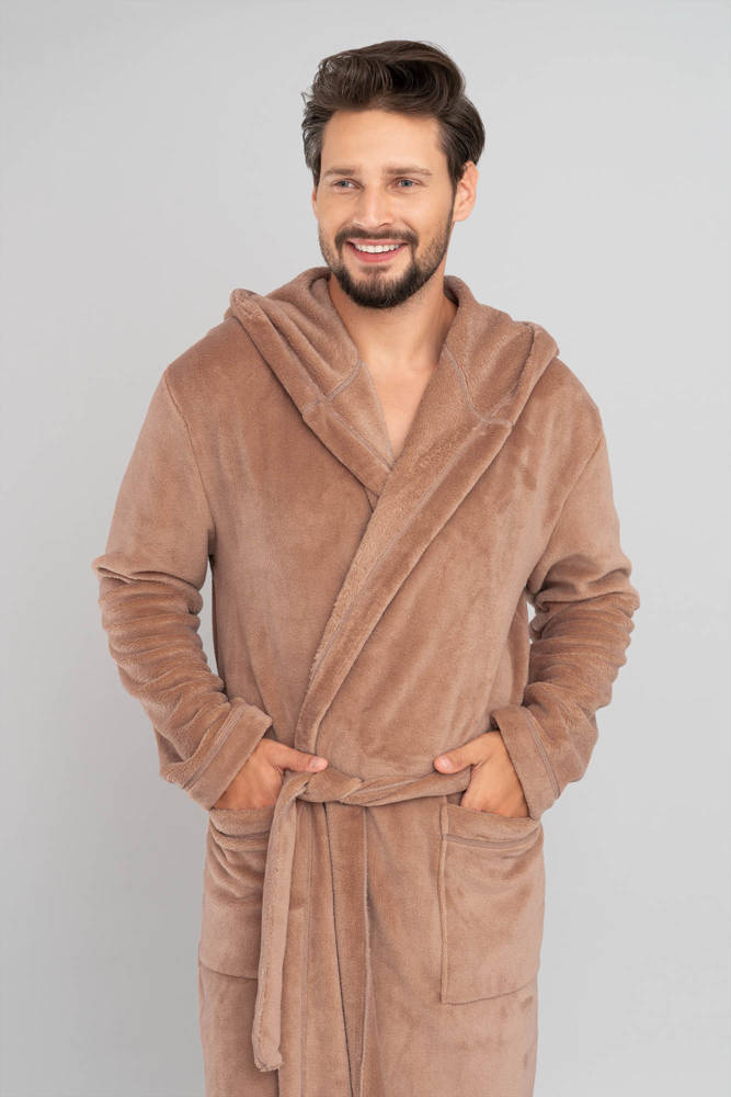 Lungo accappatoio da uomo con cappuccio, legato in vita.