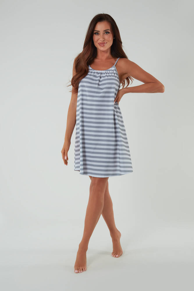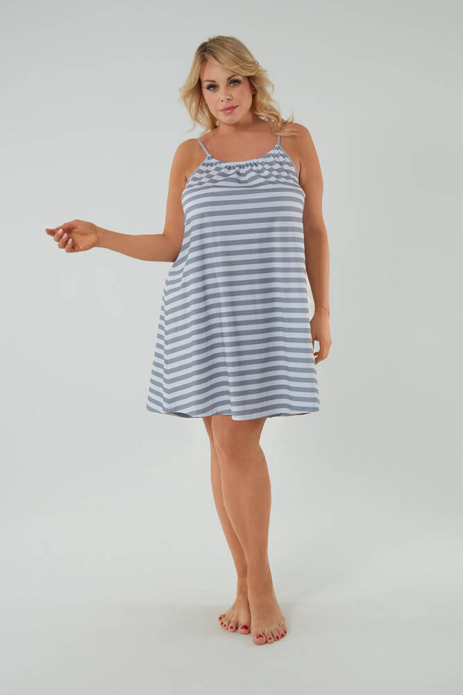 La camicia da notte senza spalline è un'ottima scelta per le donne che apprezzano l'eleganza e il look raffinato. Ha un taglio a trapezio ampio che vi farà sentire a vostro agio nelle notti più calde. Scollo rotondo superiore arricchito da pieghe decorative sia davanti che dietro. Inoltre, è possibile regolare la lunghezza delle spalline e l'ampiezza della scollatura. Aggiungete che la leggera biancheria da notte è decorata con un classico e intramontabile motivo a righe. Ha una pratica lunghezza prima del ginocchio. La nostra camicia da notte è stata confezionata in cotone morbido e piacevole per il corpo.