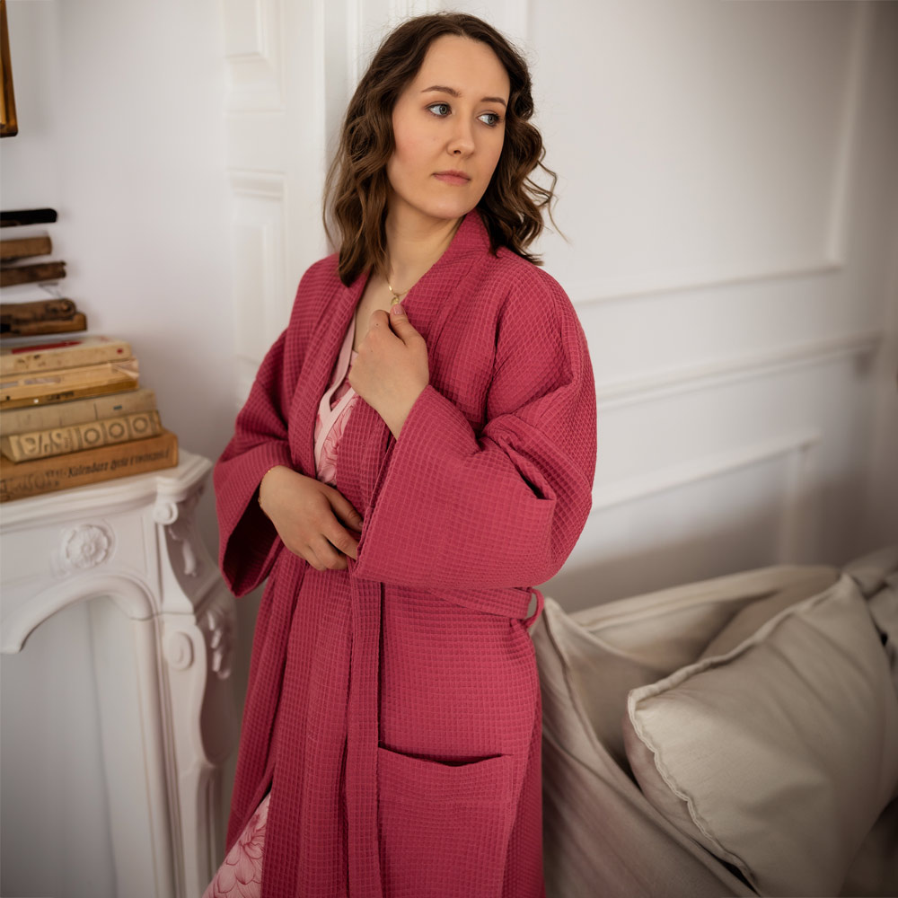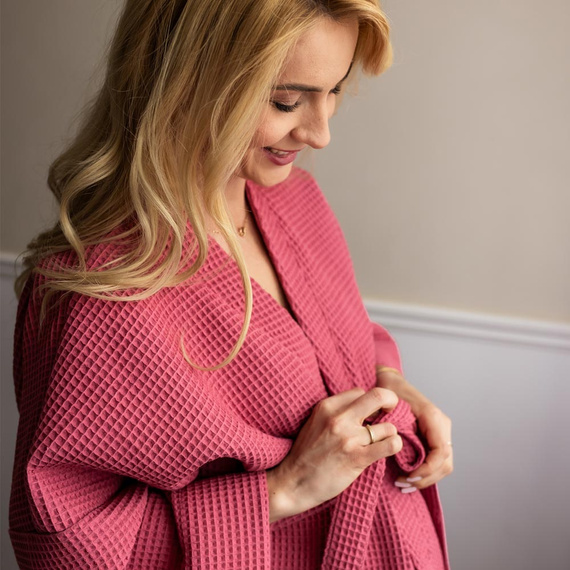 Szlafrok został zaprojektowany z myślą o mamach, dlatego jest nieco dłuższy, abyś spokojnie okryła nim ciążowy brzuszek. Posiada kieszenie na niezbędne drobiazgi i pasek do regulowania szerokości. która podkreśli Twój styl. Idealnie pasują zarówno do porannej rutyny, jak i wieczornych chwil relaksu.