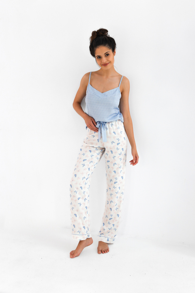 Pigiama estivo da donna con motivo a farfalla. Maglietta senza spalline. Completo di pantaloni lunghi e larghi. Cintura in vita con elastico e nastro legato.