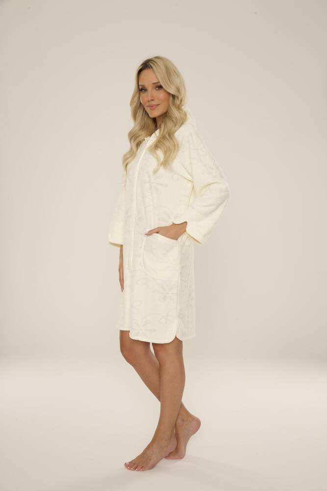Accappatoio FOREX da donna con taglio dritto. Lunghezza al ginocchio, tasche laterali, chiusura con zip. Tutte le uniformi. In morbida spugna con motivo in rilievo. Pile all'interno. L'accappatoio si adatta perfettamente alla forma del corpo. Avvolgersi in esso dopo il bagno è un piacere!