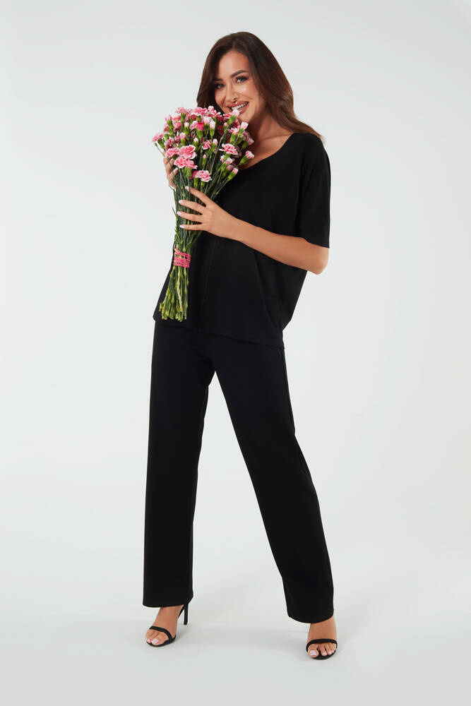 Pantaloni della tuta da donna in viscosa per le donne che apprezzano il comfort e l'eleganza classica. Sono realizzati in un materiale traspirante e anallergico. I pantaloni eleganti hanno una vestibilità ampia e gambe dritte. Sono dotati di una fascia elastica in vita, in modo che il tutto possa essere perfettamente adattato alla figura. Due tasche funzionali sui lati. Per completare l'insieme, si può acquistare una camicetta dello stesso colore, della collezione Soler, creando un set alla moda per l'ufficio o per una passeggiata. Inoltre, sono pantaloni della tuta ideali da indossare in casa. Un'opzione eccellente non solo per una giornata calda.
