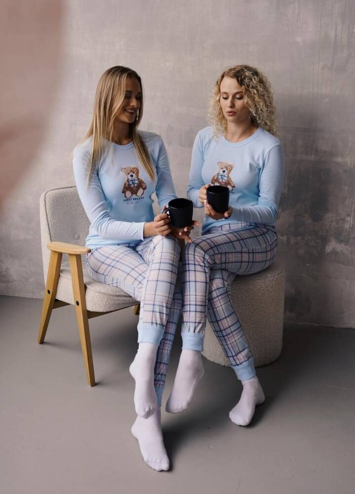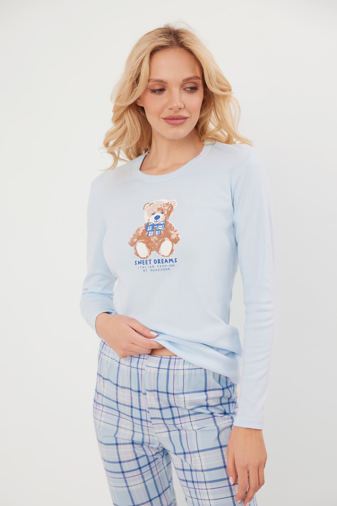 I pigiami da donna Katrin si distinguono per la loro linea leggermente aderente, che offre comfort e accentua la silhouette. La blusa a maniche lunghe ha uno scollo rotondo e una stampa decorativa con un simpatico orsetto e la scritta "Sweet Dreams" Italian Fashion by Guazzone. I pantaloni dal taglio classico, con un motivo a quadri alla moda sul fondo delle gambe, sono dotati di pratiche coulisse che li tengono fermi ed evitano che si sollevino durante il sonno.