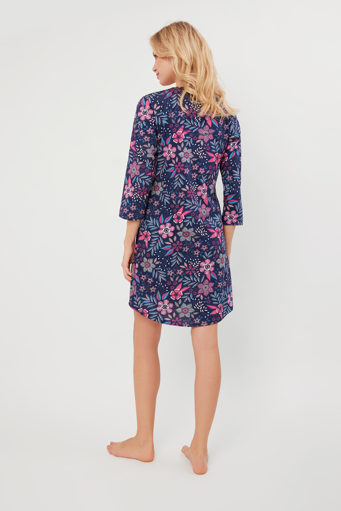 Questa camicia da notte in cotone è pensata per le donne che vogliono dare un tocco di raffinatezza al loro guardaroba notturno. Ha un taglio comodo e leggermente svasato che vi farà stare comode durante il sonno. Si distingue per una stampa alla moda di fiori e foglie colorate, che rende l'insieme molto originale. La camicia da notte sbottonata è dotata di una pratica chiusura a bottoni e di maniche a ¾.
