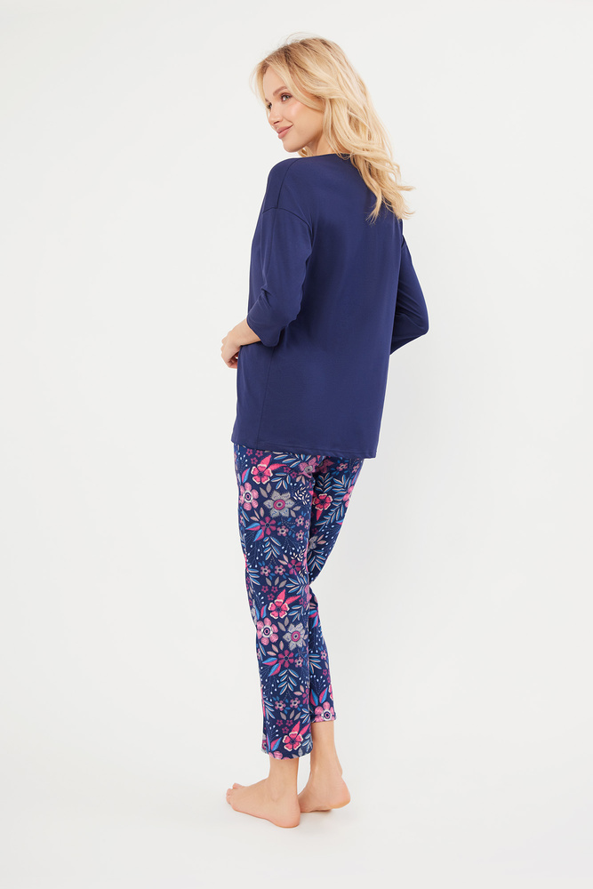 I nostri pigiami da donna in 100% cotone sono la quintessenza dello stile e del comfort. Ha un taglio semplice che sarà perfetto non solo per la sera, ma anche per il relax mattutino e serale. Il top, con maniche a ¾, è variegato con scollatura a V. Viene mantenuto in tinta unita. Il fondo del pigiama elegante da donna è costituito da un pantalone 7/8 con stampa floreale e fiocco in raso. Una scelta ideale sia per l'uso quotidiano che per le gite fuoriporta.