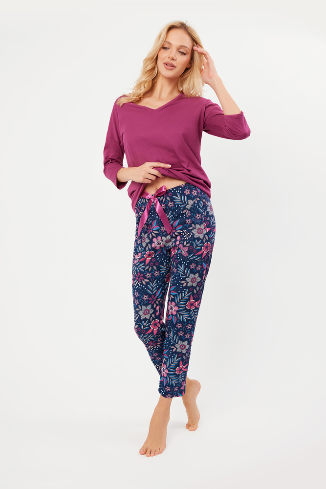 I nostri pigiami da donna in 100% cotone sono la quintessenza dello stile e del comfort. Ha un taglio semplice che sarà perfetto non solo per la sera, ma anche per il relax mattutino e serale. Il top, con maniche a ¾, è variegato con scollatura a V. Viene mantenuto in tinta unita. Il fondo del pigiama elegante da donna è costituito da un pantalone 7/8 con stampa floreale e fiocco in raso. Una scelta ideale sia per l'uso quotidiano che per le gite fuoriporta.