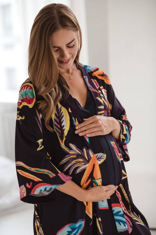Szlafrok został zaprojektowany z myślą o mamach, dlatego jest nieco dłuższy, abyś spokojnie okryła nim ciążowy brzuszek. Po porodzie bez skrępowania b będziesz mogła spacerować po szpitalnym korytarzu lub na leżąco nakarmiła maluszka w połogu. Posiada kieszenie na niezbędne drobiazgi i pasek do regulowania szerokości.