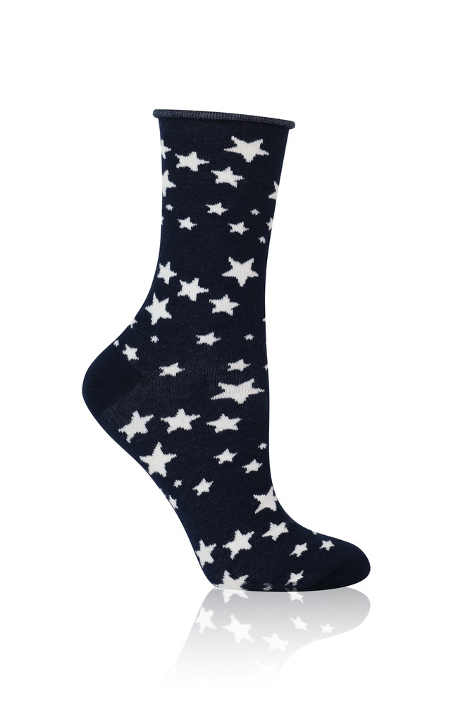 Le calze senza pressione rifinite con orlo arrotolato sono da anni sempre più apprezzate nelle successive collezioni di calze della moda italiana. In questa stagione assumono i capi della famiglia Arugia e Libra, camicie e pigiami stampati con il motivo a stella, sempre di moda.
