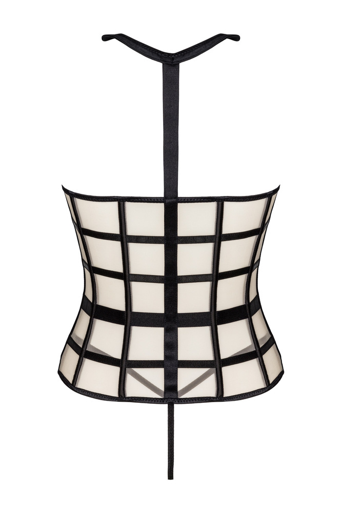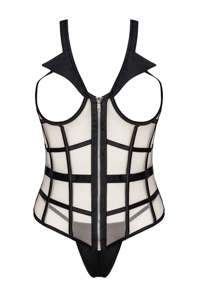 Un set a due pezzi composto da corsetto e perizoma sarà perfetto per tutte le donne che amano esporre il proprio fascino. Il corsetto si chiude con una cerniera sul davanti per facilitare la vestizione. Lo schema di colori del set è nero e beige, che insieme creano un'accattivante combinazione di colori. Per completare il set, gli adesivi per capezzoli sono un ottimo modo per ravvivare il tutto.