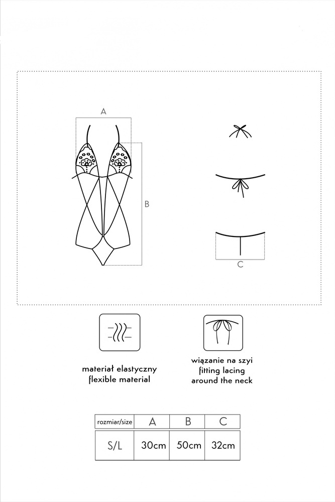 Il corpetto è composto da un reggiseno e da un perizoma in pizzo delicato con motivo a rose. Il perizoma e il reggiseno sono collegati da un groviglio di spalline che sottolineano il punto vita e le curve femminili. Reggiseno parzialmente rivelatore. Le cinghie ingegnosamente progettate che scendono tra i seni fino al perizoma slanciano otticamente la silhouette. I fianchi e le spalle praticamente scoperti, così come la schiena e il sedere che sono ornati solo da una fascia perizoma e da due lacci, rendono questa proposta audace per lei.