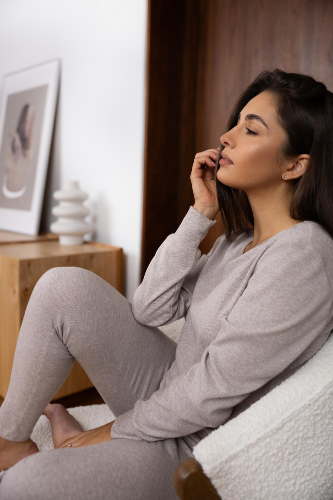 Pigiama da donna in morbida maglia a coste. T-shirt a maniche lunghe, scollo rotondo. Completo di pantaloni tipo leggings.