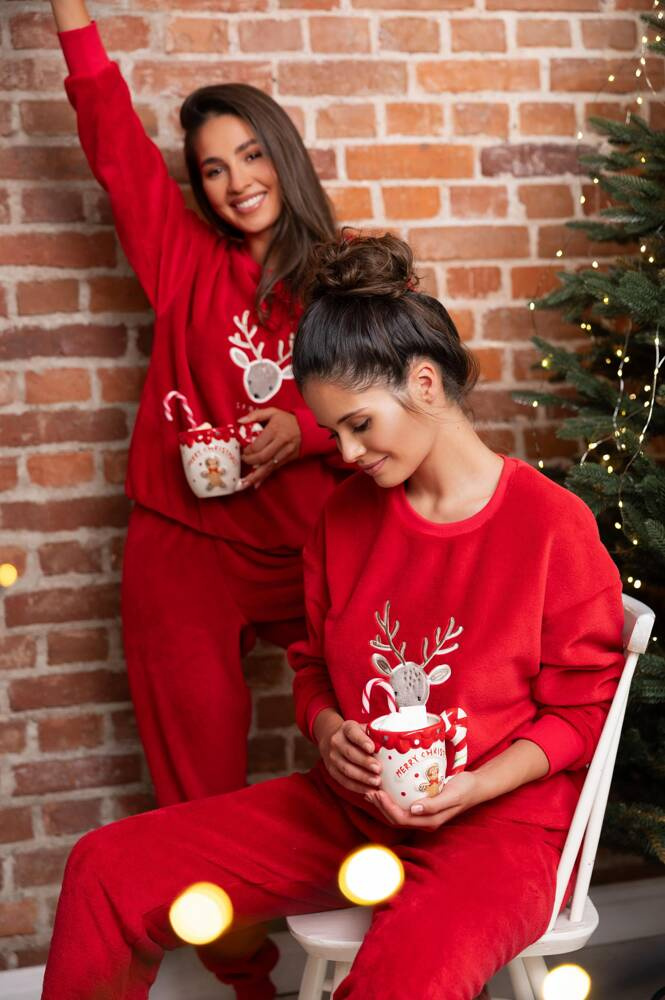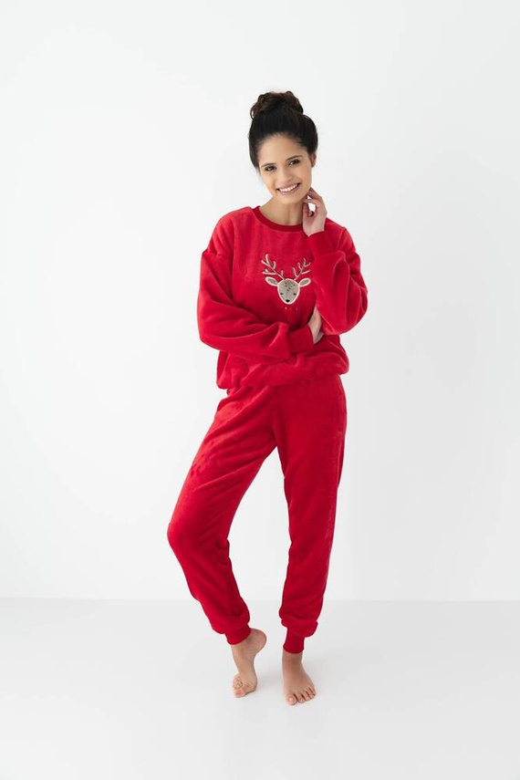 Pigiama da donna in morbido tessuto di alta qualità. T-shirt a maniche lunghe, decorata con un motivo festivo.Completo di pantaloni lunghi e solidi. Pantaloni rifiniti con coulisse. Il set valorizza perfettamente le forme.