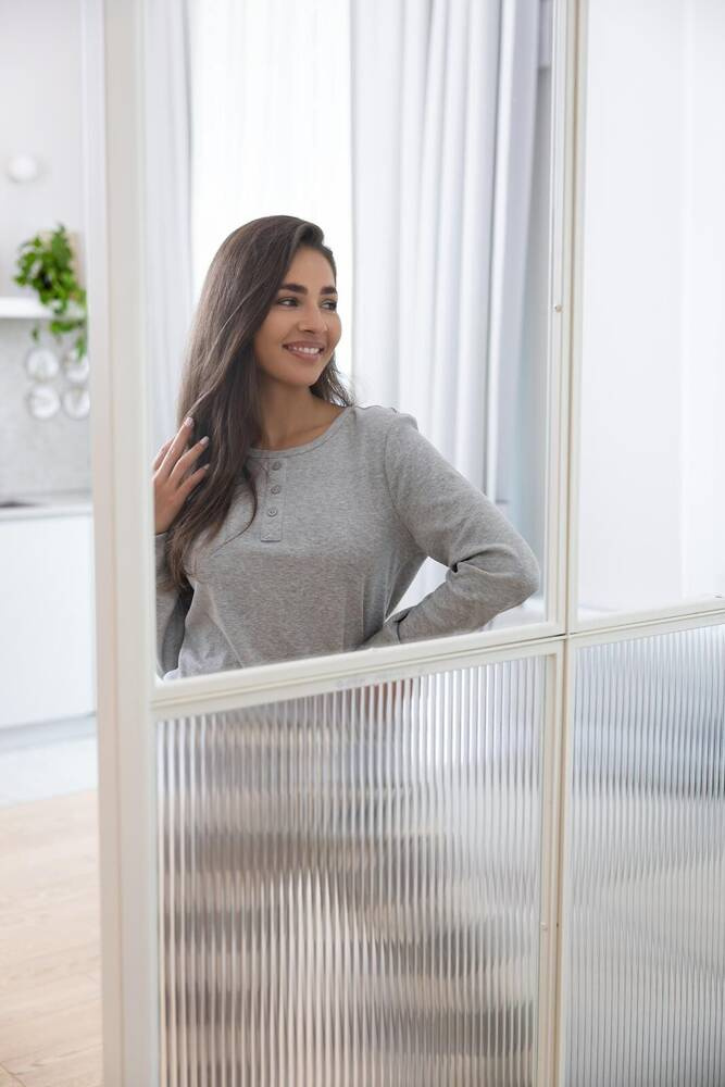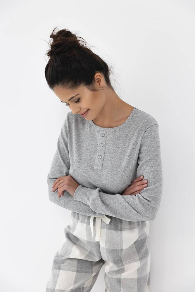 Pigiama da donna in cotone di alta qualità. Maglietta a maniche lunghe, scollo decorato con bottoni.