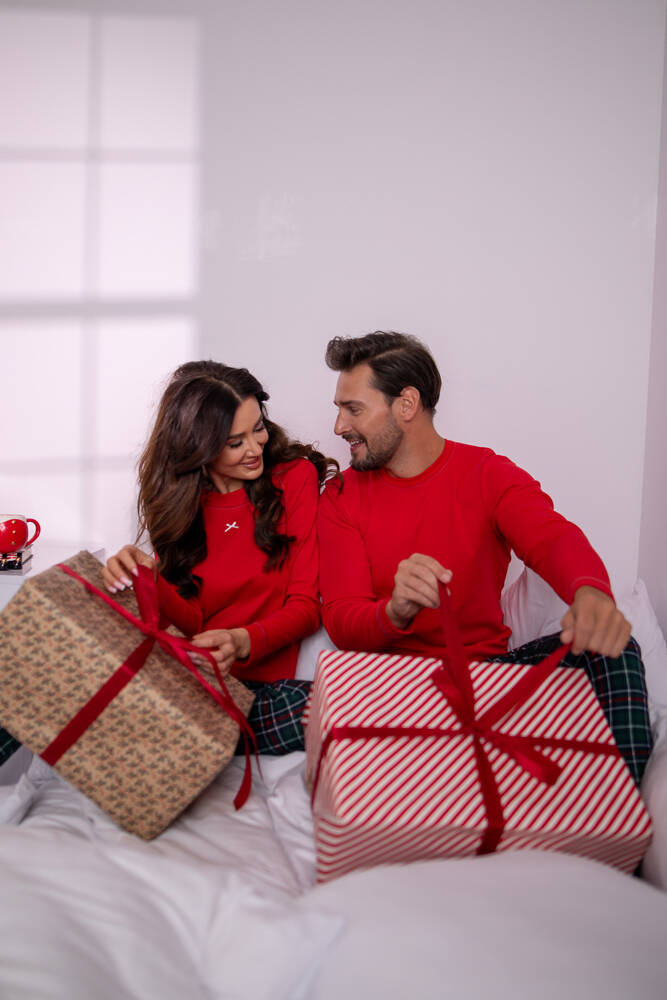I pigiami natalizi da donna sono la soluzione per le amanti del tema natalizio. Ha un taglio semplice e comodo per il comfort del sonno. Il top è una blusa a tinta unita con maniche lunghe e raglan, rifinita con filo a contrasto. Il tutto è completato da una piccola scollatura rotonda con bordino. Sotto di esso si trova un fiocco decorativo. La parte inferiore del set è costituita da pantaloni lunghi impreziositi da un'intramontabile stampa a quadri. Il set è realizzato in 100% cotone, morbido e piacevole al tatto.
