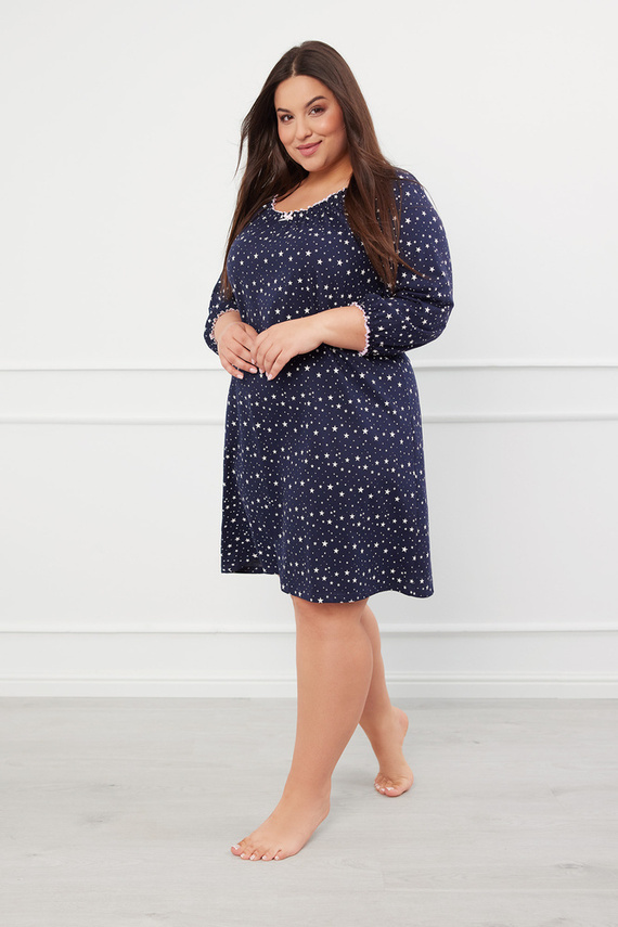 La camicia da notte romantica in piacevole cotone liscio è un modello perfetto per le donne che apprezzano la femminilità e il comfort. Ha una vestibilità ampia e uno scollo rotondo arricchito da profili a contrasto. Sotto di esso c'è un fiocco di raso. Ha anche pratiche maniche a 3/4 e una lunghezza al ginocchio. La camicia da notte da donna si distingue soprattutto per l'affascinante stampa a stelle.