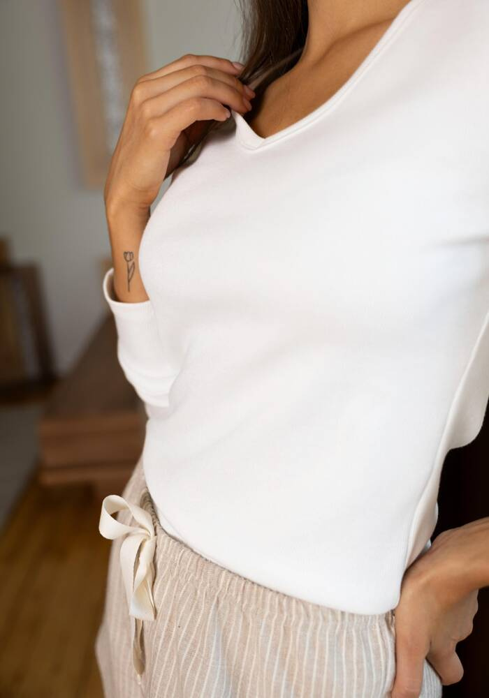 Pigiama da donna in cotone di alta qualità. T-shirt a maniche lunghe, scollo a V.