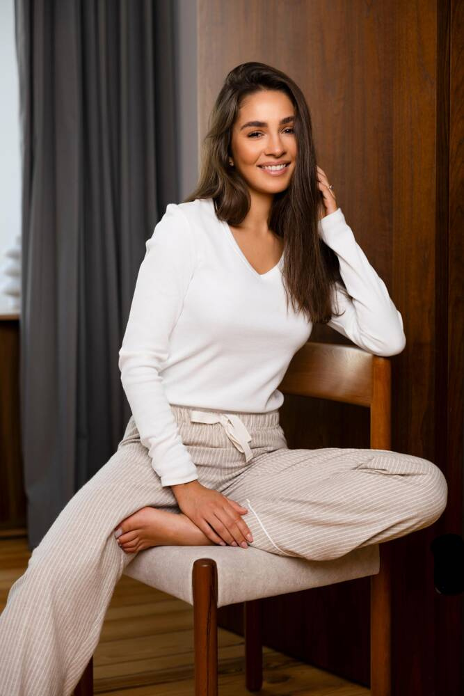 Pigiama da donna in cotone di alta qualità. T-shirt a maniche lunghe, scollo a V.