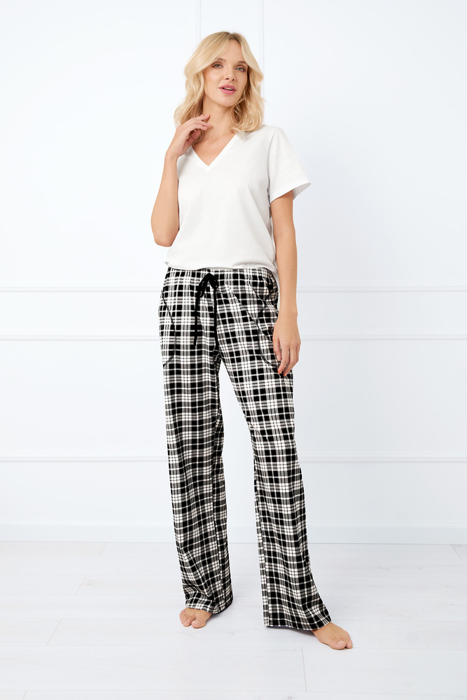 Pantaloni lunghi da donna per pigiama progettati per il comfort durante il sonno e il relax. Caratterizzato da una vestibilità classica e rilassata. Elastico in vita senza pressione con cordino decorativo. L'intero capo è impreziosito da un motivo a quadri e realizzato in cotone morbido e traspirante, ideale per tutte le stagioni.