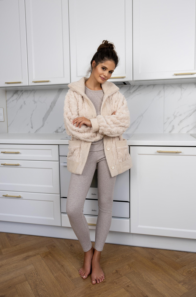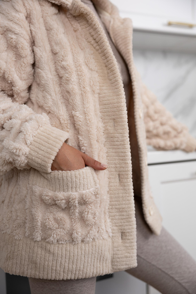 Comodo accappatoio da donna. Realizzato in morbido e soffice tessuto a maglia. Modello a metà coscia, taglio dritto con maniche lunghe. All'altezza dei fianchi ha due tasche. Taglio molto confortevole, delicatamente adattato al corpo. Si rivolge alle donne che amano la morbidezza e la libertà.