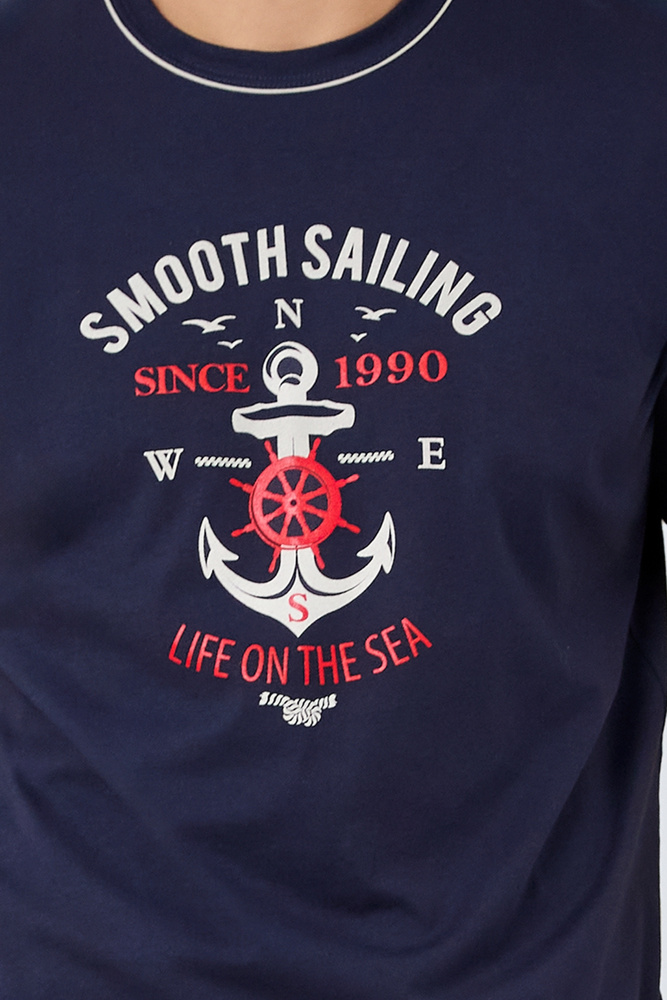 Pigiama corto da uomo in stile nautico in 100% cotone. Si distingue per il taglio semplice e confortevole. La T-shirt a maniche corte con scollo rotondo, rifinita con piping, è decorata con una stampa di ancore e scritte eleganti che ne sottolineano il carattere. Completano il set i solidi pantaloncini corti con tasche.