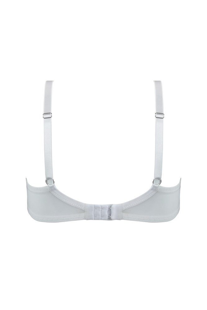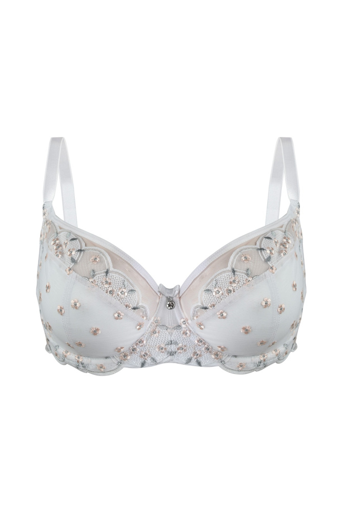 Struttura del reggiseno arricchita da una parte laterale che raccoglie perfettamente i seni l'uno verso l'altro. Vaschetta inferiore in tessuto finemente plissettato Vaschetta superiore in ricamo con lo stesso motivo. Fianchi in tessuto a maglia spessa. Lato verticale in osso di balena. Il bavet è decorato con ricami. Spallacci regolabili e non rimovibili. Fornisce il massimo sostegno e comfort.
