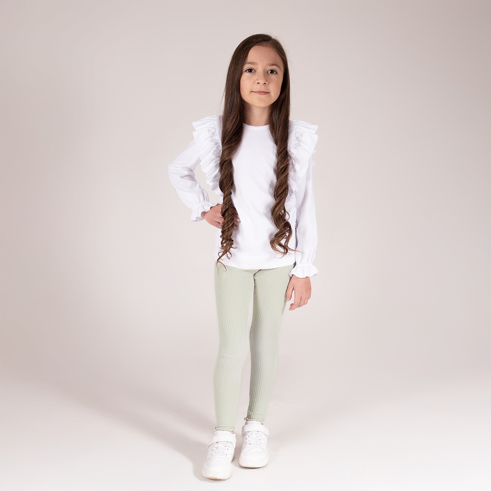 - Leggings Nicol per bambina in cotone, a coste, con volant. Oliva, confortevole, con elastico in vita. Prodotto in Polonia.