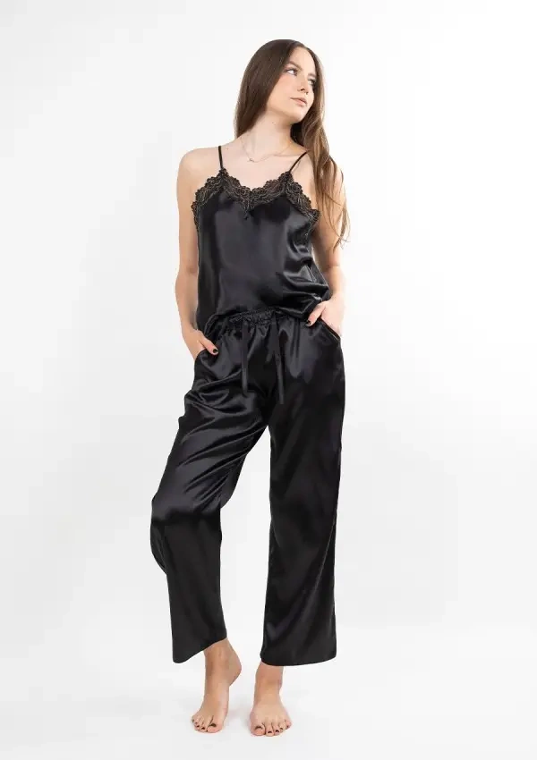 • Top nero con spalline regolabili e pantaloni lunghi e larghi con comodo elastico in vita. Il raso leggero e arioso avvolge delicatamente il corpo per un comfort e un look sensuale.
