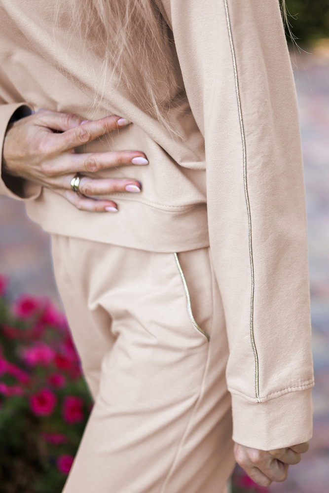 Il set è composto da una felpa dal taglio classico e da pantaloni con una comoda cintura in vita e tasche. Impreziosiscono la tuta con delicate impunture lucide sulle maniche e sulle tasche, conferendole un carattere unico.