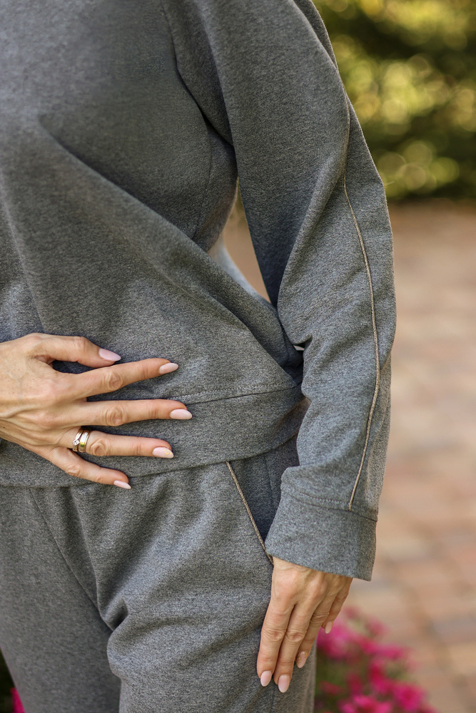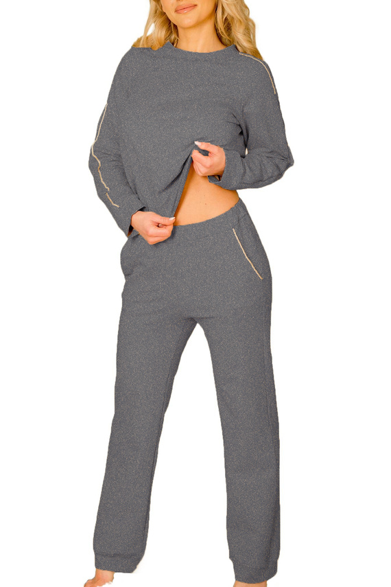 Il set è composto da una felpa dal taglio classico e da pantaloni con una comoda cintura in vita e tasche. Impreziosiscono la tuta con delicate impunture lucide sulle maniche e sulle tasche, conferendole un carattere unico.
