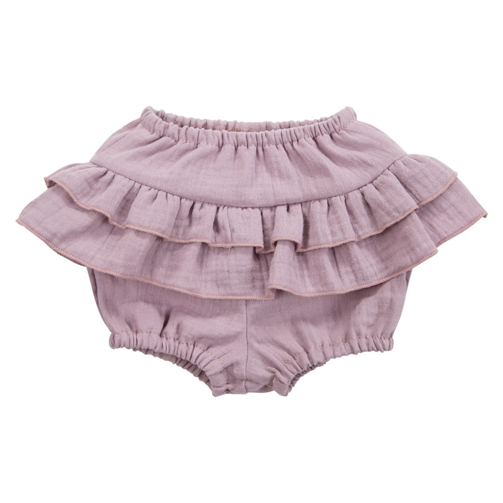 - Morbidi bloomers per una bambina.Realizzato in mussola di cotone traspirante. Il colore dell'erica e le balze danno un tocco delizioso. Ideale per l'estate, i servizi fotografici e l'eleganza di tutti i giorni.