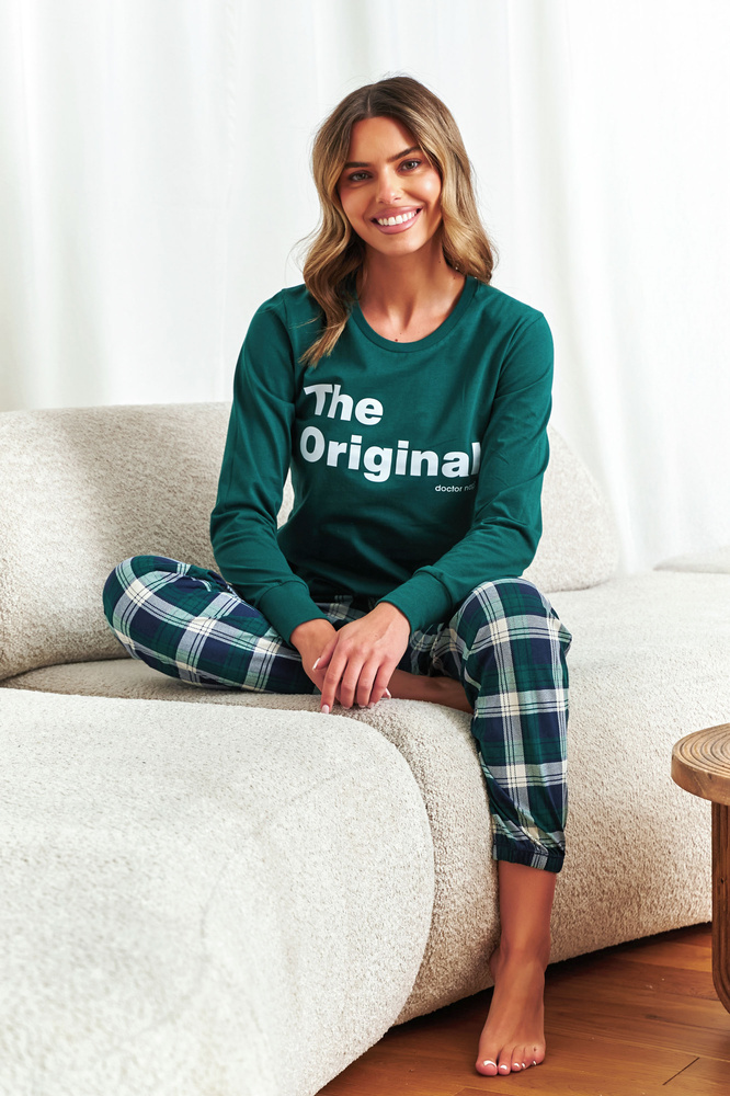 Il pigiama da donna Doctor Nap 7340 è un set confortevole perfetto per tutte le stagioni. La blusa in cotone a maniche lunghe con stampa "The Original" abbinata a pantaloni a quadri crea un look classico e moderno. Importante: il modello 7340 può essere completato come pigiama per tutta la famiglia: mamma, papà e bambino possono dormire in set coordinati! La produzione polacca è garanzia di alta qualità e lavorazione accurata.
