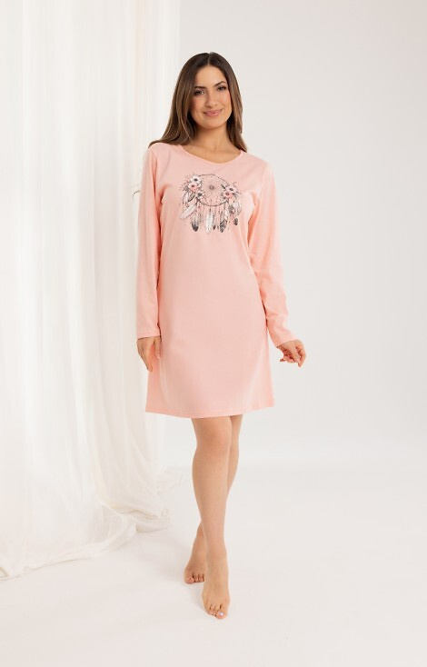 162 Camicia da notte in cotone Regina albicocca - manica lunga, stampa, sotto il ginocchio