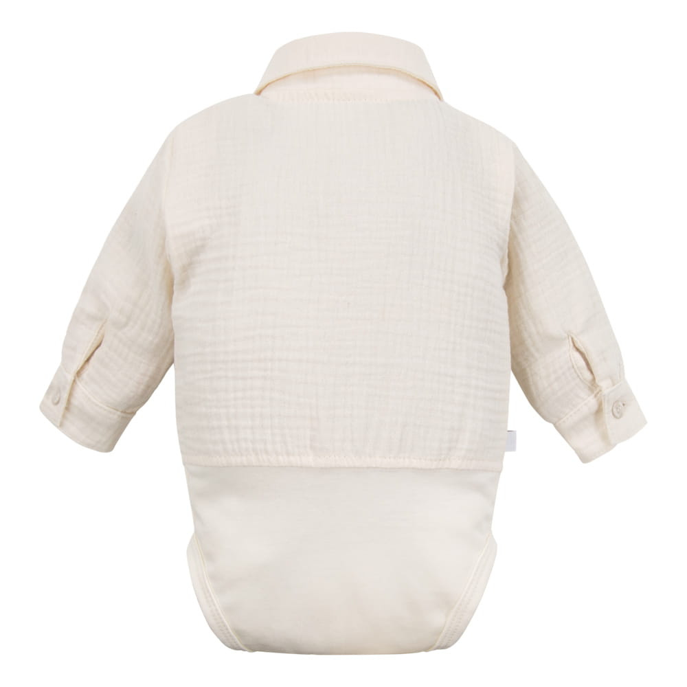Il body ha un taglio classico da camicia con colletto, che conferisce eleganza pur mantenendo la funzionalità: grazie alla chiusura con bottoni a pressione sul cavallo e sulla spalla, vestire il vostro bambino è rapido e comodo. Il tessuto di mussola è leggero, arioso e delicato per la pelle del bambino.
