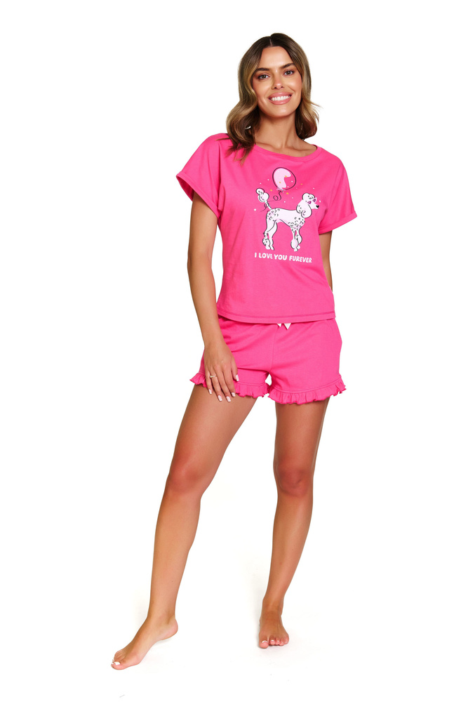 Doctor Nap 7357 è un pigiama da donna che unisce il comfort al fascino femminile. Realizzato in morbido cotone di alta qualità, è perfetto per le notti e le mattine d'estate. La T-shirt a maniche corte è decorata con la stampa di un adorabile barboncino e la scritta "I love you furever". I pantaloncini corti con volant e fiocco in raso aggiungono leggerezza e fascino. Sono i pigiami perfetti per le donne che amano giocare con la moda, anche a casa.