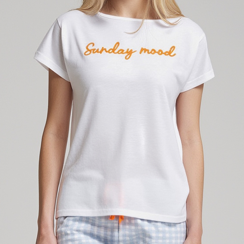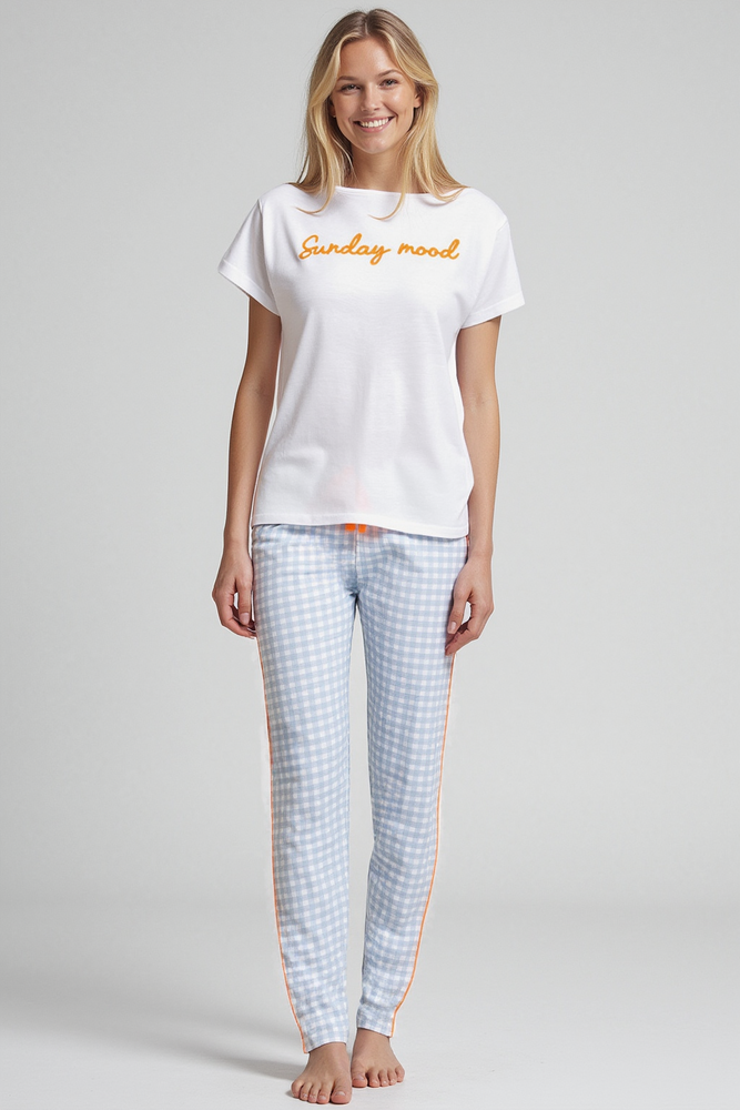 - Pigiama donna Dana Sorbetto in cotone. T-shirt con ricamo e maniche corte, pantaloni a quadri blu e bianchi con profili e coulisse. Tessuto naturale, taglio confortevole.