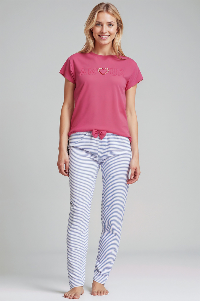 Juliana Sorbetto rosa - pigiama donna 100% cotone, con ricamo e pantaloni lunghi a righe