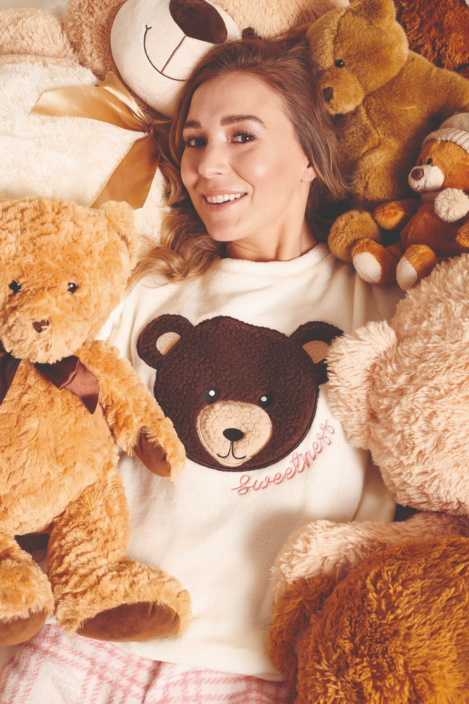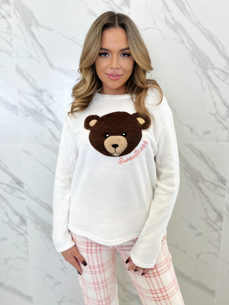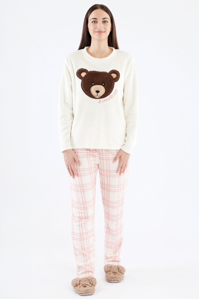 Pigiama donna Madlen Sorbetto ecrù - in pile, con ricamo orsetto e pantaloni a quadri