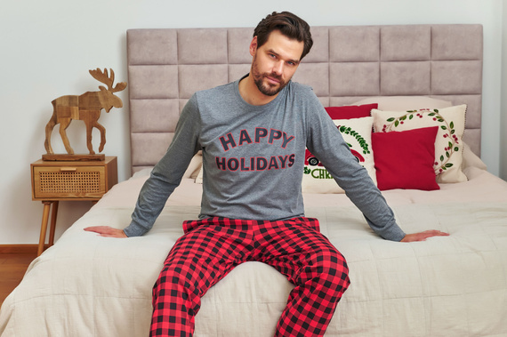 - Pigiama da uomo comodo ed elegante. Felpa grigia con stampa "Happy Holidays" e pantaloni a quadri rossi e neri. Cotone naturale 100%.