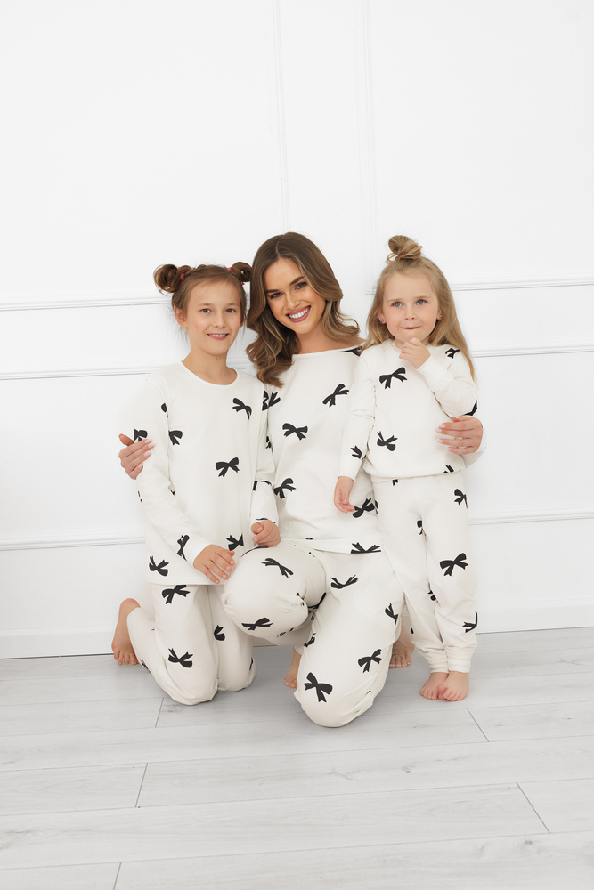 • Pigiama da bambina Figaro in ecrù, in 100% morbido cotone. Adornato con un simpatico motivo di fiocchi neri, con maniche lunghe e pantaloni a coste. Confortevole, ideale per le notti più fresche.