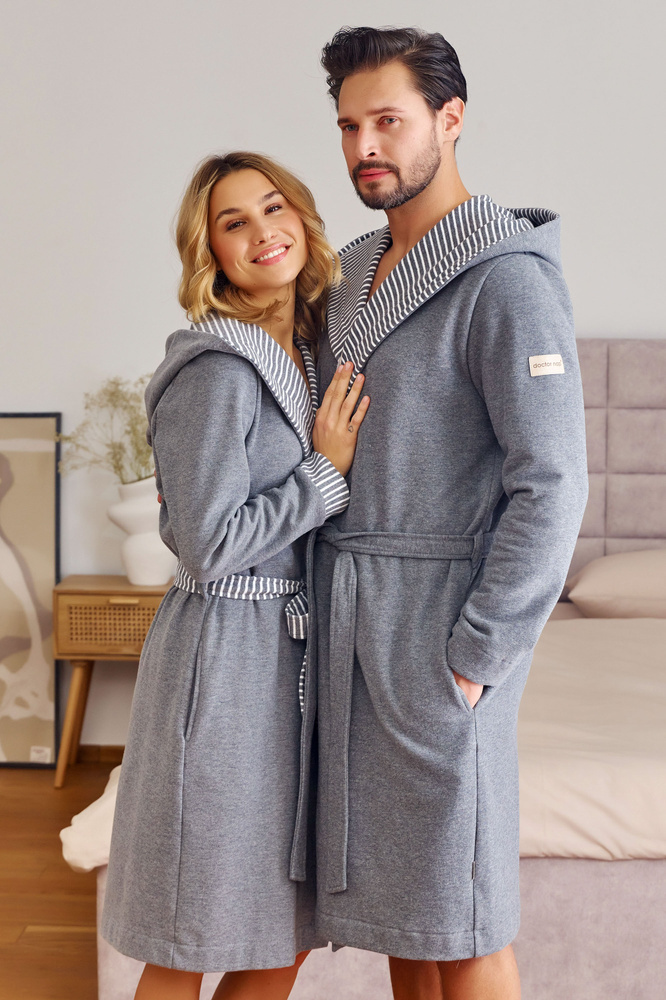 7230 Accappatoio da uomo Doctor Nap - cotone, cappuccio, finiture eleganti - grigio scuro